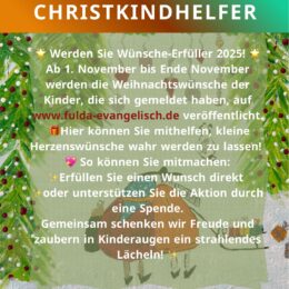 Werden Sie Wünsche-Erfüller 2025! Ab 1. November bis Ende November werden die Weihnachtswünsche der Kinder, die sich gemeldet haben, auf www.fulda-evangelisch.de veröffentlicht. Hier können Sie mithelfen, kleine Herzenswünsche wahr werden zu lassen!